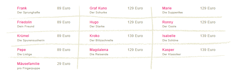 Sie können die Handpuppen per Mail, Post oder Telefon direkt